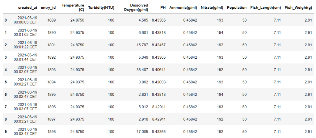 It is wise to read the data card and discussion carefully before doing any exploratory data analysis. The data comes from HiPIC Research Group, Department of Computer Science, University of Nigeria Nsukka, Nigeria. It is a study on aquaponics in 12 different ponds (data for Pond 5 is missing). Each pond has various sensors connected on an ESP32 recording temperature, nitrate, ammonia, turbidity, and dissolved oxygen. Each measurement is at a 5-second interval.