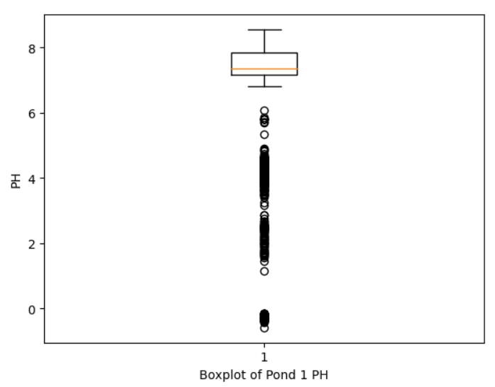 We note various issues with the statistics. The average levels of ammonia, nitrate, and dissolved oxygen are incredibly high. Ammonia is incredibly toxic to fish even at 1 mg/L. Ideally, we want ammonia to be 0 (see Chapter 3 of FAO). We suspect that the columns have been scaled in some way. Fortunately, the data transformation we perform later will remove this unknown scaling. In general, it’s not harmful to have high level of nitrate, but large amount of nitrate indicates inefficiency. We should add more yummy veggies. The average of pH is 7.5, which would lead to nutrient deficiencies. Plants absorb nutrients better under a slightly acidic environment, preferably between 6-7 (see Lennard and Goddek, 2019). We obtain the plot and boxplot of Pond 1’s pH below using