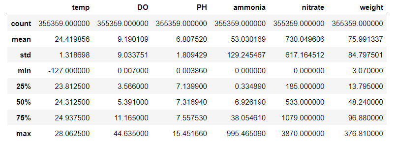 From the heatmap, we see that there is strong correlation between weight, nitrate, and ammonia, which is as expected. When the pH is high, the nitrifying bacterias can not convert ammonia to nitrates, so the correlation is negative. Furthermore, as the fish grows larger, there is more ammonia for the bacterias to convert to nitrates. When ammonia is oxidized into nitrites and nitrates, hydrogen ions are produced, thus decreasing the pH level. On the other hand, the temperature and dissolved oxygen levels are usually kept constant, so there is very little variance to have correlation with the weight. This tells us that we can remove dissolved oxygen and temperature from our model with negligible effect. Note that the correlation between pH and weight should not be that high as we generally keep the pH level balanced. Earlier, we saw that there were errors in the pH readings.