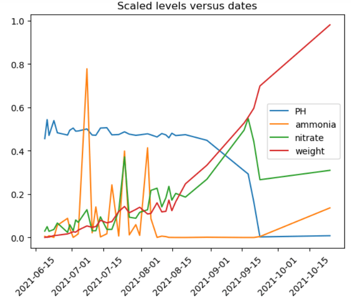 Note that even though ammonia level spiked a few times, eventually it stabilized. The nitrate level kept increasing, which indicates inefficiency. A large amount of nitrates were not utilized. Finally, we observe that the pH levels are not correct at the end, which cause the correlation between pH and weight to be very high as we noted above.