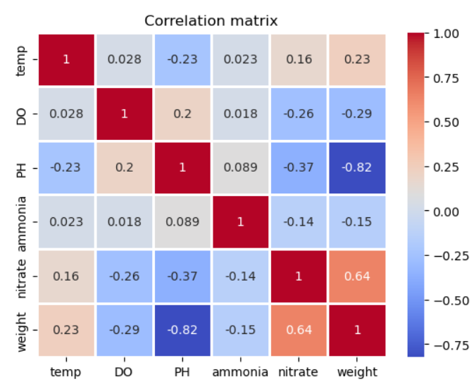 From the heatmap, we see that there is strong correlation between weight, nitrate, and ammonia, which is as expected. When the pH is high, the nitrifying bacterias can not convert ammonia to nitrates, so the correlation is negative. Furthermore, as the fish grows larger, there is more ammonia for the bacterias to convert to nitrates. When ammonia is oxidized into nitrites and nitrates, hydrogen ions are produced, thus decreasing the pH level. On the other hand, the temperature and dissolved oxygen levels are usually kept constant, so there is very little variance to have correlation with the weight. This tells us that we can remove dissolved oxygen and temperature from our model with negligible effect. Note that the correlation between pH and weight should not be that high as we generally keep the pH level balanced. Earlier, we saw that there were errors in the pH readings.